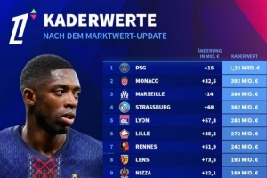 法甲球队身价排名:巴黎12.2亿欧断层居首,摩纳哥3.92亿欧次席