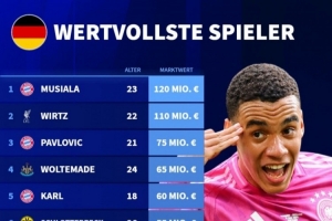 德国球员德转身价榜:穆西亚拉1.2亿欧居首,维尔茨1.1亿欧次席